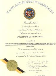 全体议员对这一具有纪念意义的活动表示最衷心的祝愿,并将此决议在2001年11月3日呈交。 马里兰州众议院(Maryland House of Delegates)决议号:1329