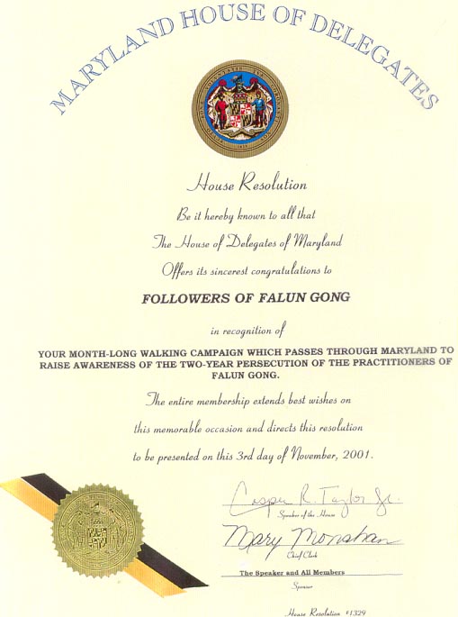 为赞誉你们途经马里兰州一月来的步行运动,借此希望世人关注对法轮功修炼者两年之久的迫害,马里兰州众议院至此对法轮功修炼者表示最诚挚的祝贺。