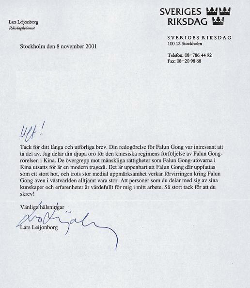 谢谢您寄来的长而详细的信。你们为法轮功进行的活动使人感到愿意参与。对中国政府镇压法轮功运动,我与你一样很担心。在中国,对法轮功学员人权的侵犯是一个现代悲剧。很显然中国政府视法轮功为威胁,尽管媒体对此给予很大的关注,但是在西方仍然还有很多人不了解真相。向您这样能把自己的体会和观点与别人交流的人,对我和我的工作有很大的价值。所以,非常感谢您写给我的信!