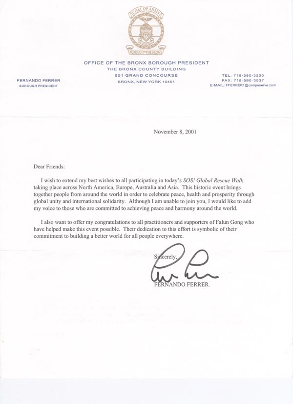 我也祝贺全体促成这一事件的法轮功学员及其支持者。他们的努力奉献展示了他们为人类重建更美好的世界的誓言。