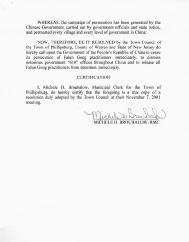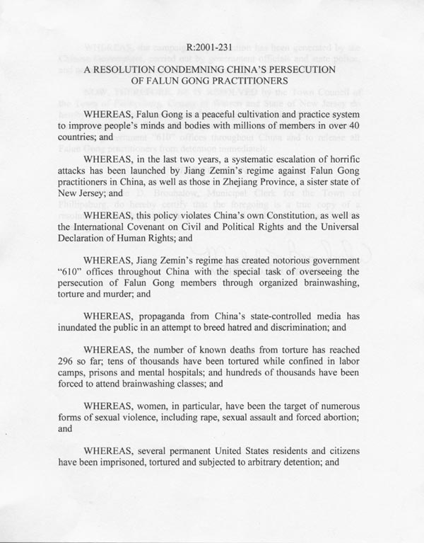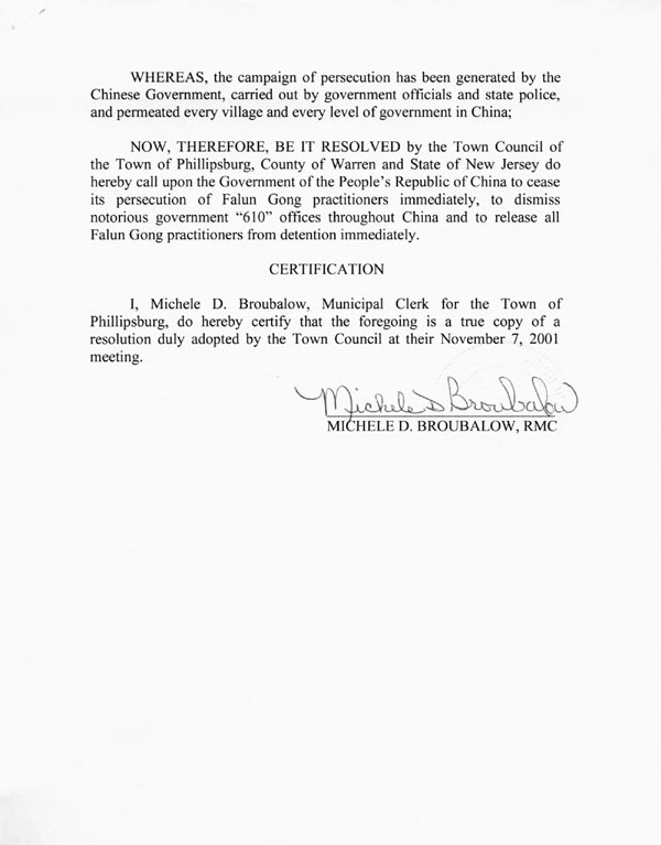 【明慧网2001年11月20日】新泽西州菲利浦斯堡市市议会2001年11月7日通过决议,呼吁中国政府立即停止对法轮功修炼者的