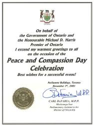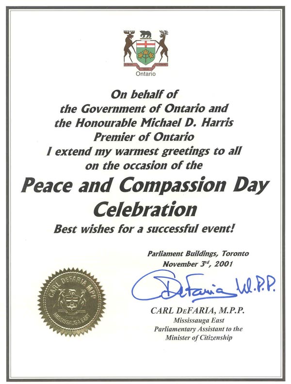 省议员卡尔.德富理亚是安大略省长麦克.哈里斯的得力助手之一,经过学员们两年来持续不断地讲清真相,德富理亚先生不仅本人积极支持大法,而且数次向省长讲真相,要求省长表态。经过他的努力,哈里斯省长此次终于顺应民意,同意由德富理亚省议员代表省长和安大略省政府,向倡议并主办11月3日“和平与善良日”的法轮大法学员正式寄来最热烈的祝贺(原文请见下图)。