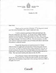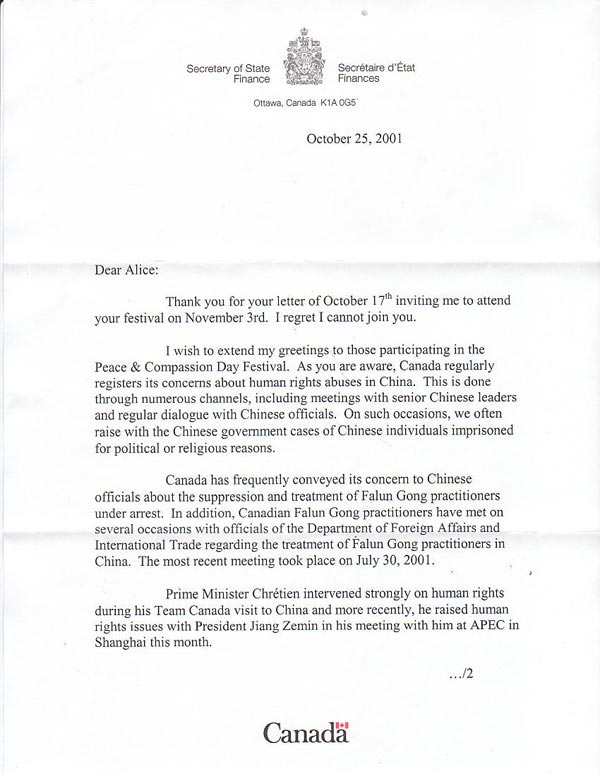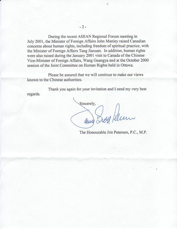 加拿大政府内阁部长级国会议员、财政部次长(Secretary of State-Finance)吉姆.皮特森在贺信中首先表达对“和平与善良日”的祝贺,然后以一页多的篇幅详细叙述加拿大政府对大法的支持并详细介绍了政府过去两年对中国迫害法轮功学员的问题与中国方面多次交涉的情况。信中重申加拿大政府“继续把我们熟知的观点传递给中国当局”。(贺信原文如下)