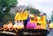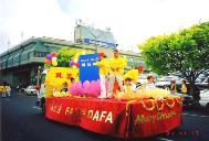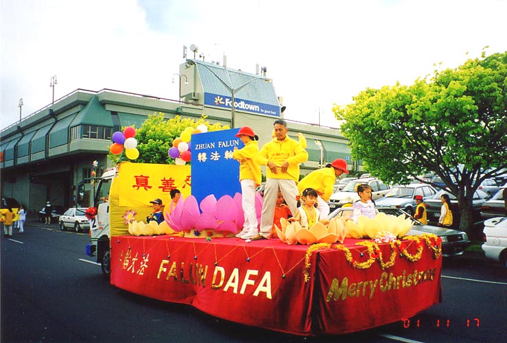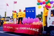 虽然天气预报说当天有小雨,但是游行开始时,天一下子晴朗起来,以太阳为中心有一个巨大的彩色光环出现在天空。我们的花车上蓝色的《转法轮》在粉红色的莲花座上显得格外醒目,圣洁的莲花配上学员舒缓,柔美的动作将法轮功的五套功法展示给观众。在我们的花车最前面是:“法轮大法”,“真善忍”,两条大横幅,后面是两排学员打着“真善忍”的小旗,路边的观众不断地向我们招手,还有很多孩子好奇地问他们父母什么是法轮大法,坐在莲花上的是不是花仙子,我们的游行队伍走过一个拐弯处后就进入了主道,一眼望去,两边的观众把道路围得水泄不通,当我们的花车出现时,人群中发出了赞叹声,每个人都被大法震撼了,很多观众不约而同地为我们鼓掌,还有几个当地人边跟著我们的花车走,边问,“什么是法轮大法”,当得知是一套真正的中国气功时,说“我们十分感兴趣,她太美了。”