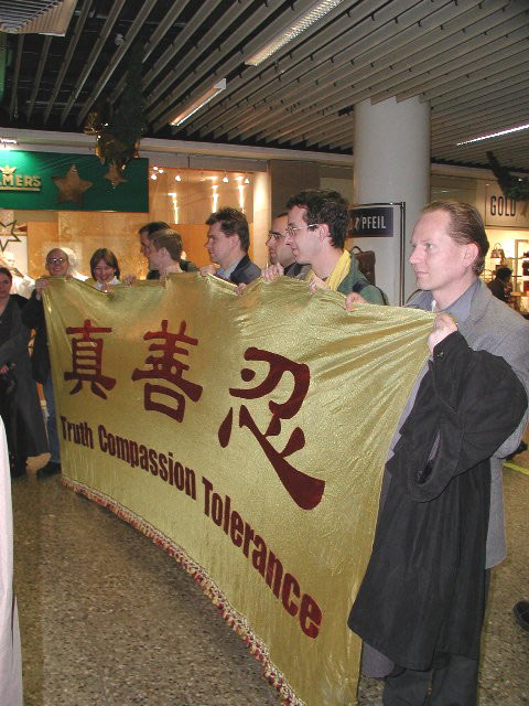 会上学员介绍了他们北京之行的目的,意在唤起世界公众和各国政府对中国政府镇压法轮功的关注,并能挺身而出支持正义。学员们讲述了他们自20日下午一时许在天安门广场展开“真善忍”横幅后20个小时内的经历:强行被警察塞入警车,带到警察局,逐入暗无天日的地下监狱,无论男女学员,都被警察任意粗暴推搡拖拉,全然不顾学员的抗议。随后他们又被带到一家旅店,关进一大房间内。四周警察严密监视,上厕所要两个警察陪同,而且不许关门。他们被多次盘问,被要求在一些中文文件上签字,遭到拒绝后,部分学员遭到殴打。这样一直持续到凌晨四五点钟,警察都累得睡着了。北京时间21日上午11时,这8名德国学员和4名瑞士学员被直接从该旅馆押至机场,送上飞往法兰克福的航班。