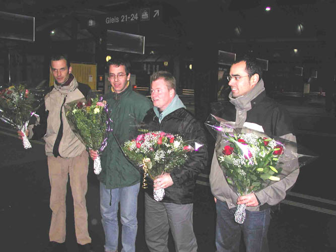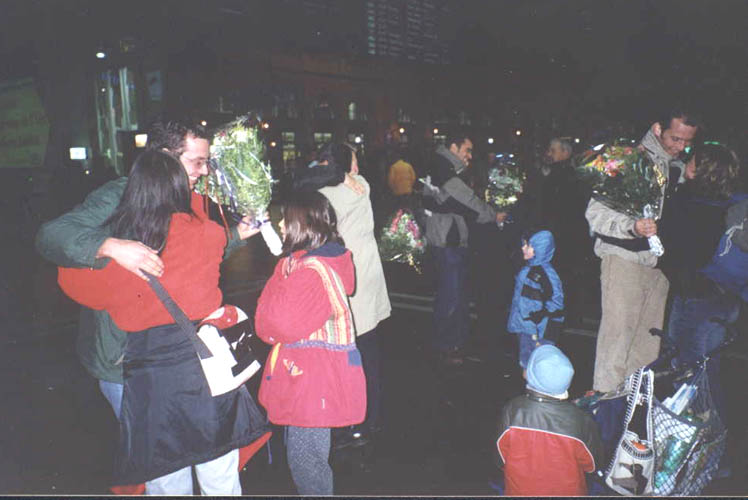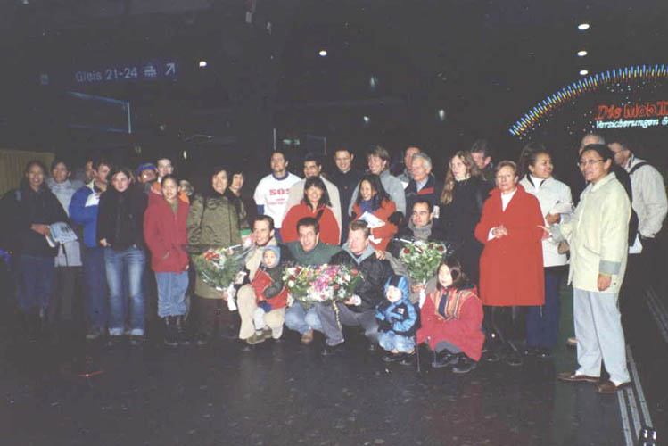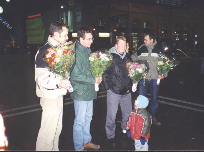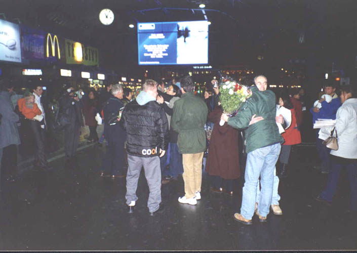 夜11点,当四位瑞士大法弟子走进车站大厅时,大家热烈鼓掌,欢迎这些参加北京正法壮举的弟子们胜利归来,向他们致敬!四位年幼的小弟子捧着鲜花走上前去,学员们眼含热泪,互相拥抱,情景十分感人!