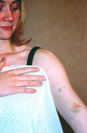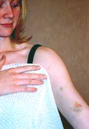 【明慧网2001年11月26日】请看,这就是江泽民集团对在天安门广场和平请愿的西方法轮功学员的“人道”待遇。这是法国学员海伦.佩蒂(Hélène PETIT)被天安门广场恶警殴打,四天后仍清晰可见的伤痕。