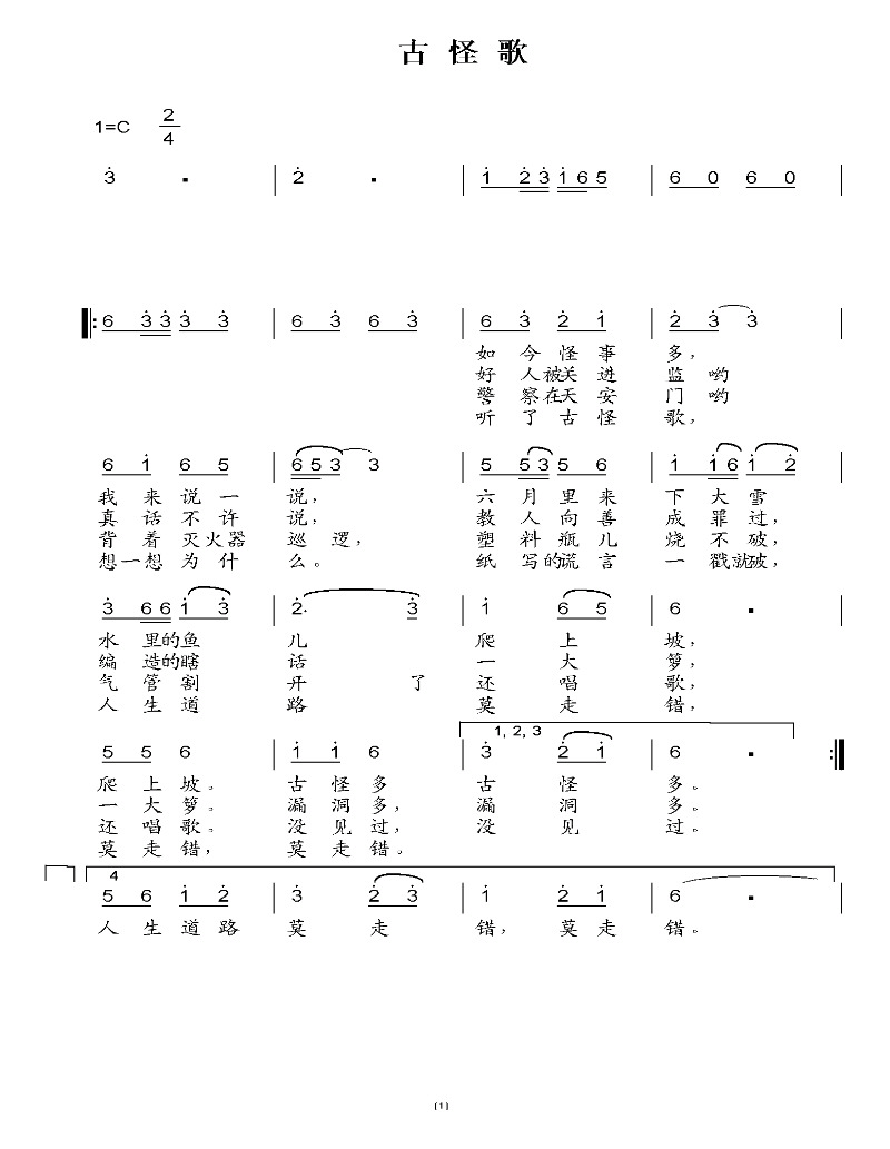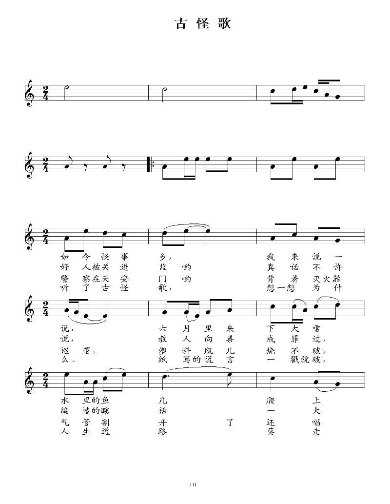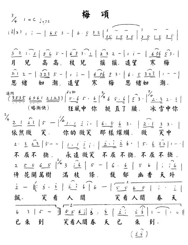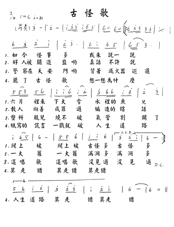 | 梅颂(歌词) 月儿高高,枝儿摇摇, | 古怪歌 (歌词) 如今怪事多, 好人被关进监, 警察在天安门 听了古怪歌, |