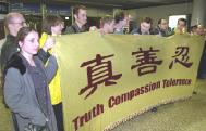首批被驱逐出境返抵旧金山的三位法轮功学员,今天在机场受到湾区法轮功组织的英雄式欢迎。但他们在五年内不得再到中国。