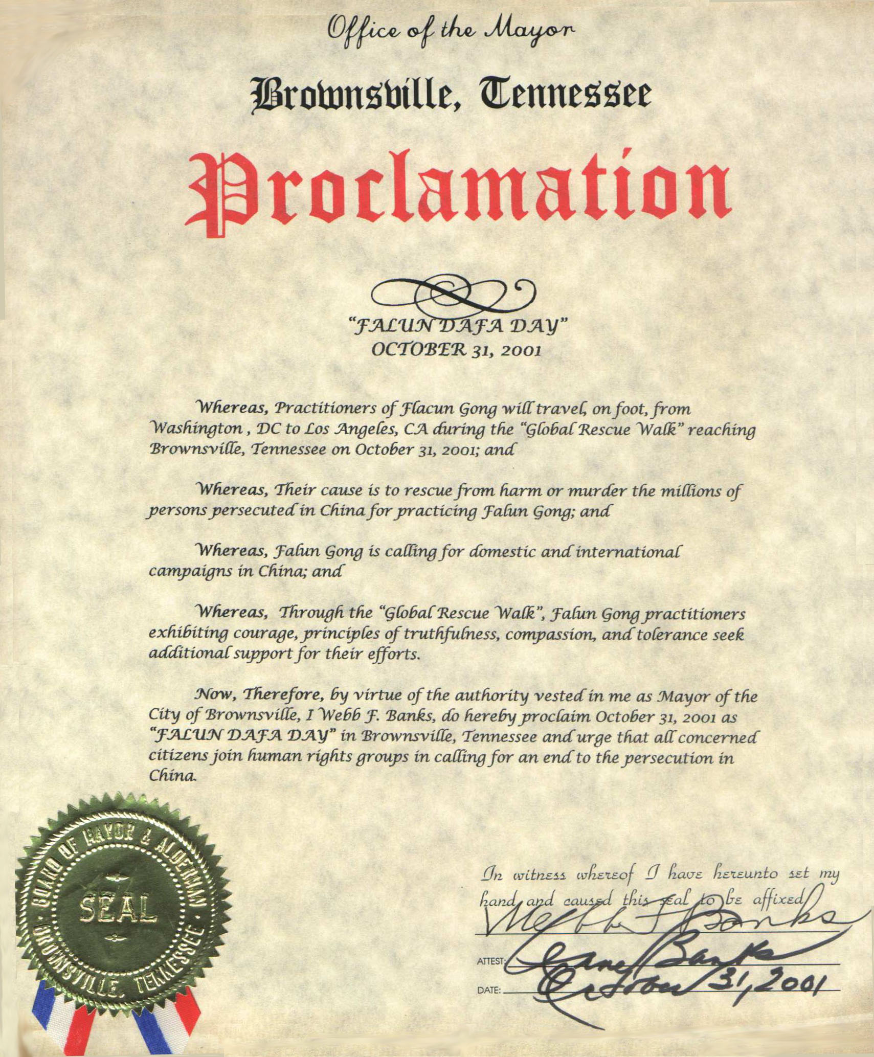 【明慧网2001年11月4日】田纳西州布朗斯维尔市市长魏博.班克思宣布2001年10月31日为田纳西州布朗斯维尔市的“法轮大法日”,并敦促所有市民加入人权组织,呼吁制止发生在中国的这场