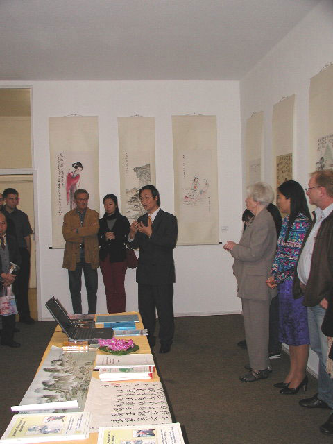 当我们呈上今晚的画展请柬时,他说他一定会光临。晚上突然下起了倾盆大雨,当他出现在我们面前时,我们都被感动了。他十分惊叹我多姿多彩的艺术风格,尤其对我的两幅大作:3米长、半米宽的“重峦叠嶂”及7米长的“树熊百趣图”赞叹不已。他被我们内在的美、和谐、宁静所感染。他还专门采访了大法学会的负责人两个多小时。为了一篇正直、公正的报导,他整整和我们交谈了五个小时。另外还有当地的中文报纸和中文电台,通过电话采访了我们,并要报导画展及法轮功学员受迫害的事实真相。