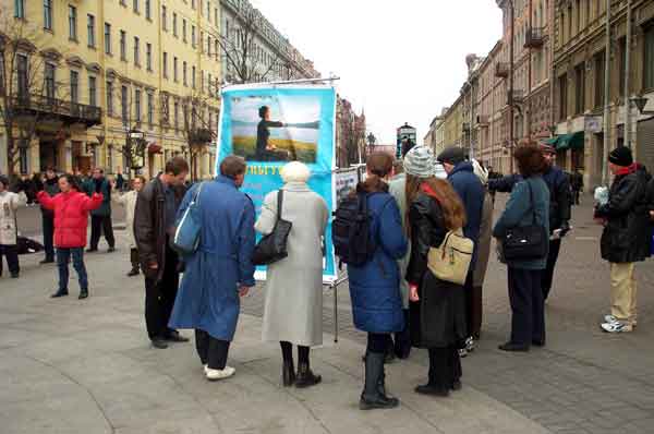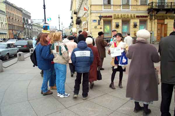 象以往一样,弟子们聚集在圣彼得堡最繁华的街道──涅瓦大街上,这是城里最美丽的地方之一,从古至今都闻名遐迩,热闹非凡的街道。在这里,人们总能看到身穿写着“法轮大法─真善忍”及“SOS”字样的黄色服装的大法弟子们在美妙的音乐伴奏下整齐而优美的炼功场面。每周六休息日来到这里向城市居民和旅游者们提供机会了解大法真相,对圣彼得堡的很多大法弟子来讲已经成了惯例。