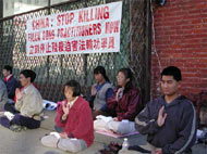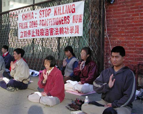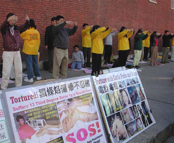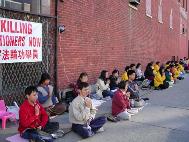 学员们在醒目的版画后面集体炼功要求立即停止对法轮功学员的虐杀集体发正念,铲除迫害大法的一切邪恶