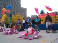 喜庆的气球、高挂的竖幅、悠扬的音乐,更有特色的是,在市政广场前的绿茵茵的草坪上,整齐地排开了三百多个小风车,随着清风,风车在旋转着,风车中心藕色的莲花也随之美妙地旋转起来。同样是小学生参与制作的三百多个纸叠的仙鹤,用丝线穿起来,好像真在风中起舞。