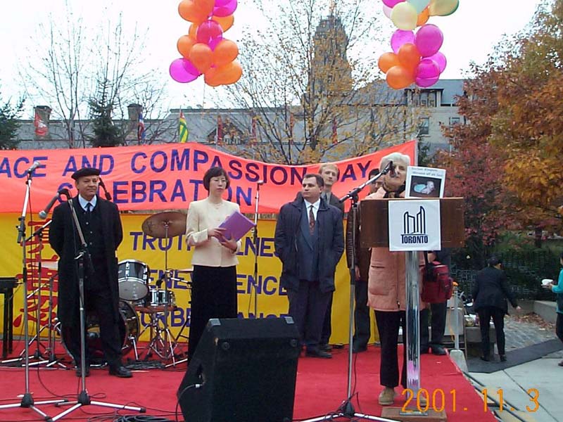 庆典在下午1:30左右进入高潮。徒步分组横跨加拿大四千公里进行“SOS环球徒步步行紧急援救中国大陆法轮功学员”活动的几组法轮功学员走上了主席台。宣读了来自沿途市政府的支持信,宣读了与大法弟子同行一个星期的高中生写来的感人肺腑的来信。当学员代表用他们最亲身的感受表达他们的心声时,在场的人们流下了热泪。而后,议员和各个非政府组织的代表,律师等相继发言,真诚,热情而且旗帜鲜明的表达了他们对邪恶的谴责和对法轮大法支持的鲜明立场。在音乐声中,几十只和平鸽冲向蓝天,欢笑与掌声在广场上响成一片。
