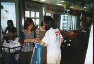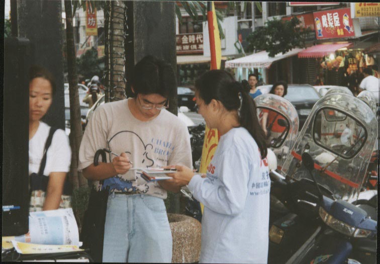 一旁有些学员派发大法简介及向民众征集签名。众所周知,签名只是我们接近常人的沟通方式,藉着交谈的机会,介绍大法真善忍的美好并讲清在中国受迫害的真相,才是我们的主要目的。偶有外国人经过,学员也把握时机“全面讲清真相”。