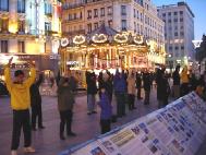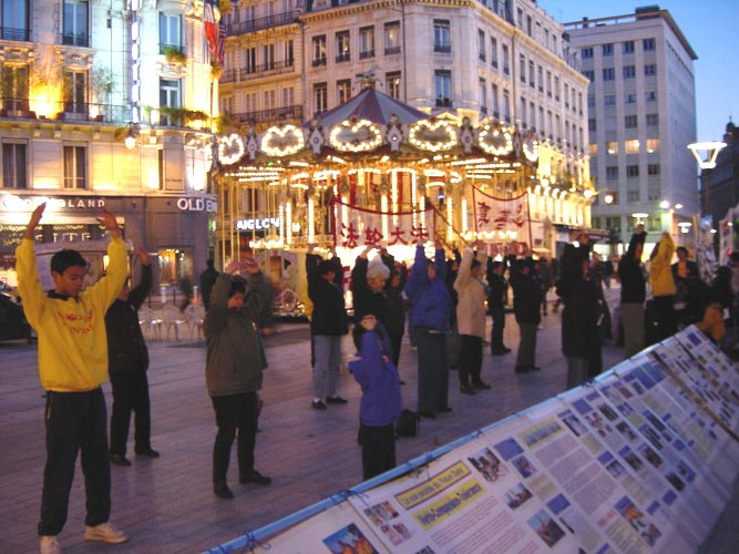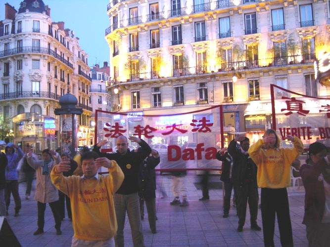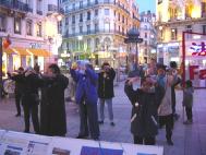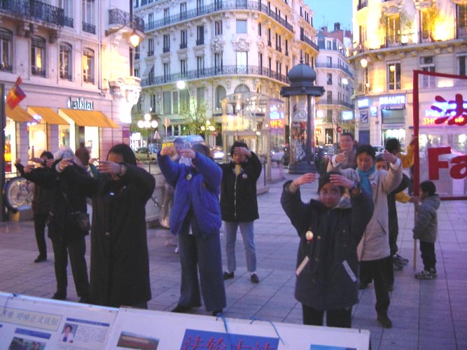 在里昂的洪法地点位于一条宽阔的步行街,而且是周末,人来人往十分热闹;再加上活动有多个人权组织参加,吸引了许多媒体和热心人权的人士,正是洪法、讲清真相的绝好时机。学员们摆好介绍法轮功真相的展板;打开横幅。有的祥和地炼功,有的接受媒体采访,有的向关心的人们介绍法轮功及江泽民政治流氓集团对法轮功学员的残酷迫害,有的向过往行人散发SOS传单……