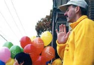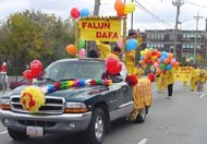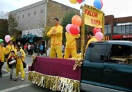 | 游行前学员集体发正念 | 学员在游行彩车上做功法表演;在人群中向儿童赠送印有“法轮大法、真善忍”字样的气球是一种非常有效的洪法方式。 | 尽管天气寒冷、风大,学员们精神焕发。 |