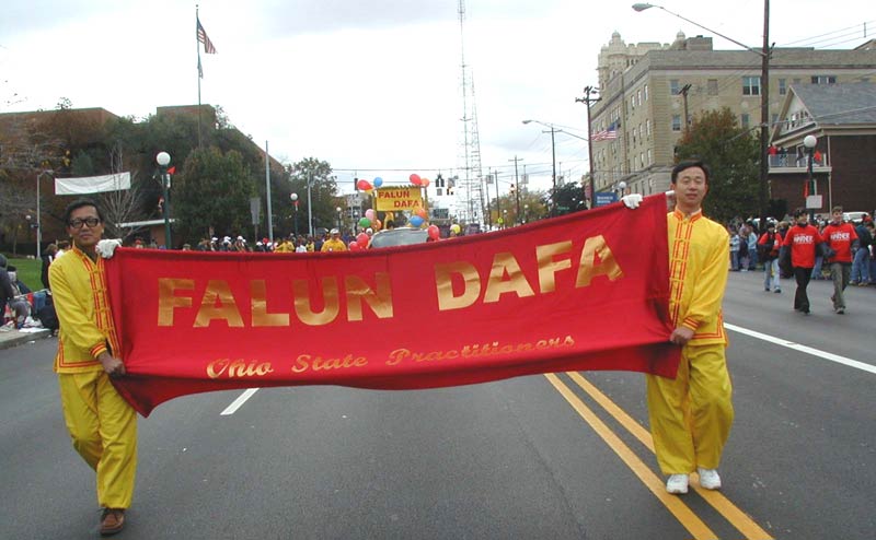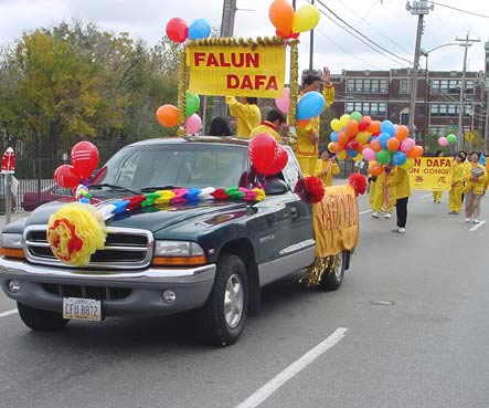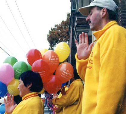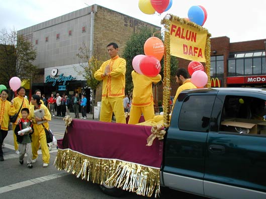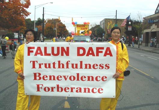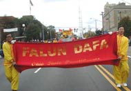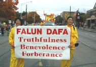 | “法轮大法--真善忍”横幅在游行队伍中格外醒目 | 如此祥和的炼功群体在中国大陆却受到残酷镇压,有正义感的人怎不愤慨! |