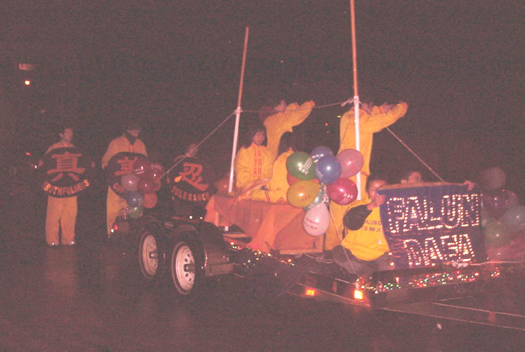 历尽磨难,学员和装饰一新的花车终于出现了,雨也停了。由于天气的影响,只有几辆花车参加了游行,大法学员们的花车是最后一辆,但也是最受欢迎的一辆。学员们有的在车前车后打着横幅和牌子,有的在车上不停地演炼着五套功法。尽管天气不好,还是有不少人来观看游行,当地电视台录下了游行的全过程。学员所到之处,有的观众向学员们挥手致意,有的鼓掌,有的鸣笛,有人大声说:这是我最喜欢的花车!我喜欢法轮功!……