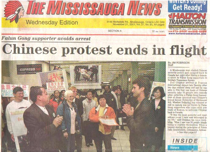 【明慧网2001年12月1日】密西沙加报2001年11月21日头版新闻报导了一名密西沙加人巧妙逃脱中国公安的抓捕,于昨晚回到加拿大的故事。他拍下了在天安门广场法轮功支持者们的请愿活动。