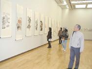 | 记者们在认真地听章翠英的介绍 | 章翠英在福冈画展全貌 |
