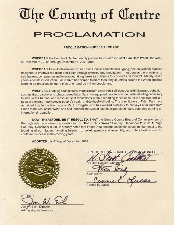【明慧网2001年12月13日】宾夕法尼亚州中央郡宣布2001年12月2日至8日为“法轮大法周”。