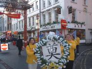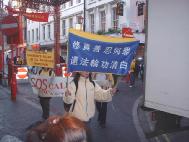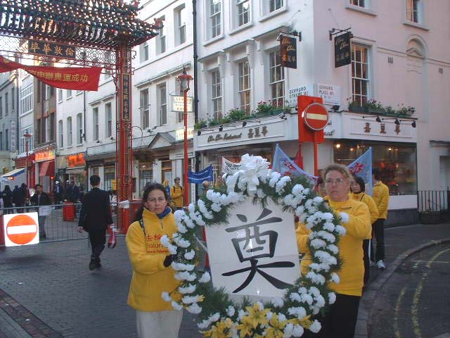 在中国大使馆外的和平活动后,两名女学员抬着一个用黄白花编制的花圈在前,身后跟着捧有受迫害致死女弟子名字的小花圈的其他女学员。其他功友则举着法轮大法的横幅,在普渡济世音乐的伴奏下,开始了游行。真相传单不断分发给行人。