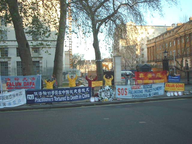 游行在抵达唐宁街首相官邸附近结束。学员们就地开始炼功和分发法轮功受迫害的真相资料。一封写给首相的信及超过10,000人签名的请愿书随后也递交到唐宁街10号首相官邸。