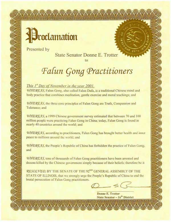 鉴此,伊利诺伊州参议院第92届年会决议:我们强烈呼吁中华人民共和国停止对法轮功修炼者的残酷迫害。