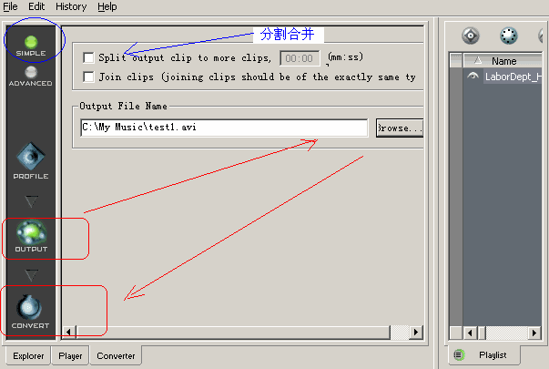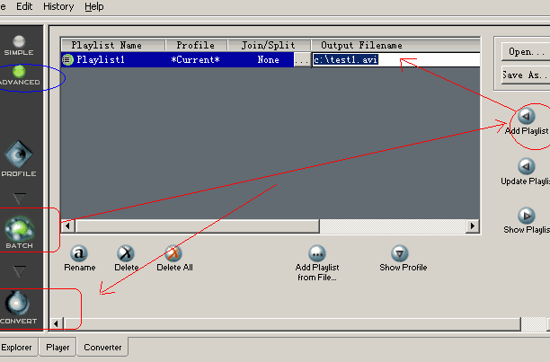 注意如果你开始选择的不是第一个按钮SIMPLE而是第二个ADVANCED,文件保存位置就要在BATCH(不是OUTPUT了)中 如下图中,先点AddPlaylist然后双击Output Filename下面的蓝条,输入相应的新文件。