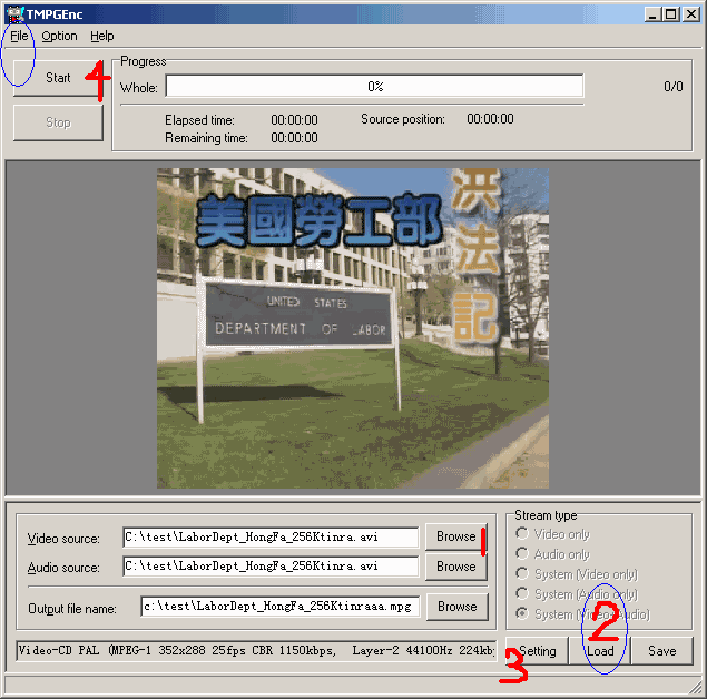 当你用EO-Video把RM转换成AVI格式时,我们就先在Video Source,Audio Source处把刚生成的同一个AVI文件选择上。然后点右下角Load的按钮,选择VideoCD (PAL).mcf(对中国格式,海外相应选择NTSC,)(VideoCD.mcf在默认的tmpgenc路径中Template路径中),如果你精通影象格式,可以手工再在Setting调整,一般不用。然后按Start就开始转成mpg文件了。
