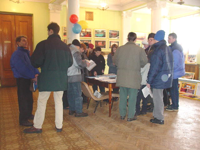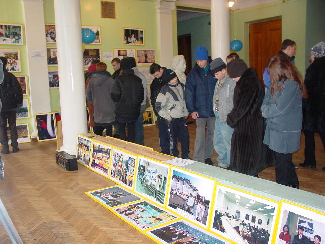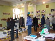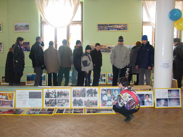 很快,这位教师带来了一班八年级的学生。刚来时,孩子们满不在乎的神情溢于言表,不时问着中国武术武打等等问题。参观开始了,从大法在中国洪传开始、到海外不同民族得法、大法在世界上得到褒奖赞誉、一直到中国江泽民集团的无理镇压以及各国学员的和平请愿及各国各级政府对大法的支持,孩子们很快平静了下来,认真看着图片和听着学员的讲解。