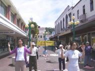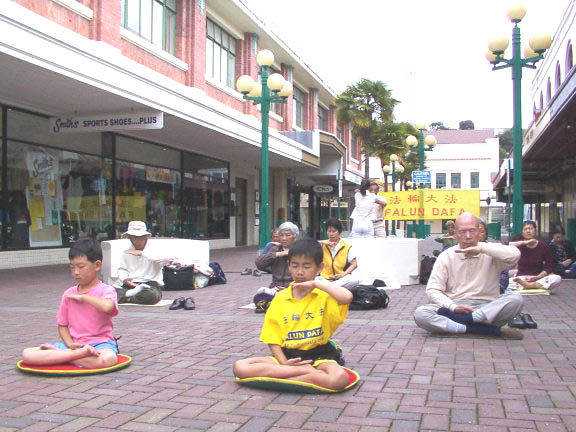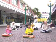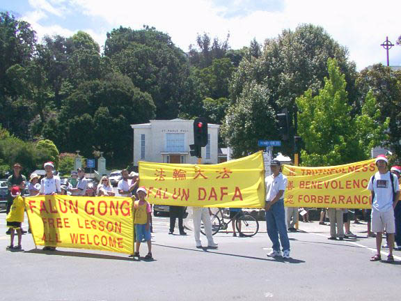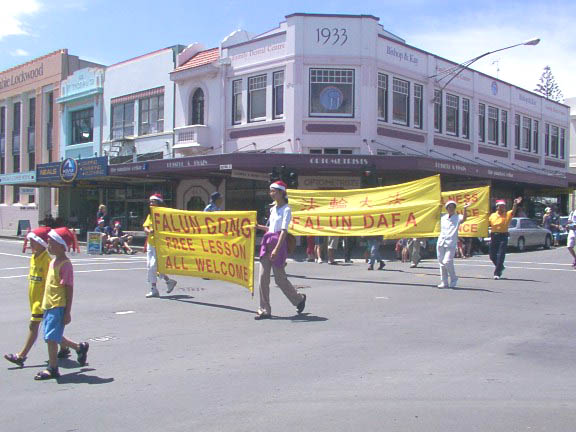 纳皮尔(Napier)是位于新西兰北岛东海岸一个充满阳光的小城市。因为当地有学员想成立新的炼功点,所以由新西兰其他各地的学员到此地支援,并在当地展开洪法炼功活动。当天是12月16日星期日,下午恰好市区有圣诞游行。虽然来不及准备花车,但是大法弟子们心想机会不可错失、要把握住此次人潮聚集的机会洪法。临时找到主办单位申请是否可参加徒步游行,主办单位马上答应。因此大法弟子不分男女老少戴着圣诞帽,打着洪法时用的三条横幅,英文「法轮大法提供免费课程」、中英文「法轮大法」、中英文「真善忍」,并在游行当中发出近千份的大法书签给围在游行道路两旁的小朋友。值得一提的是,我们队伍是安排在新西兰军队后面,当整个队伍行进到约十分钟时,新西兰军队的车子突然发生一些故障,临时退出游行队伍。因为前面花车已走远,所以我们有一大段游行是走在第一线,吸引了许多游客的注意。虽然我们没有花车,但是只要我们能把握向世人洪法的机会,发挥每个大法弟子的作用,就会有意想不到的效果出来,此时更能体会到时时保持着正念的重要性了。