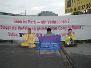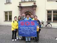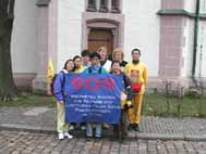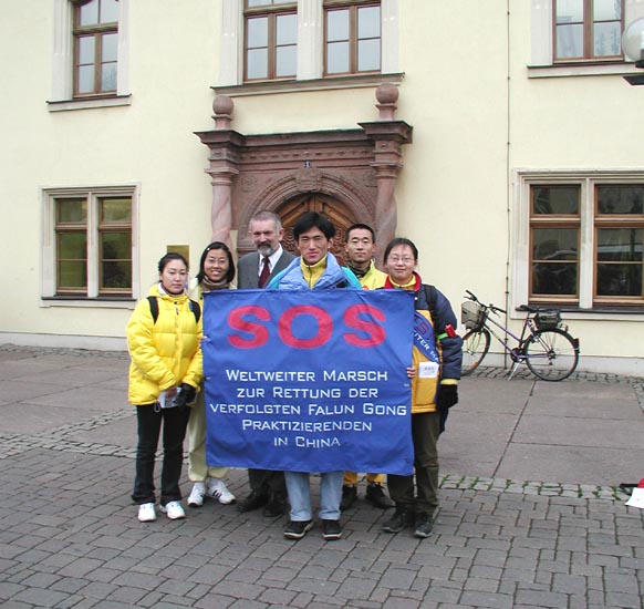 在波茨坦大学有几位教授非常支持大法,为此我们决定前去登门拜访。我们敲开了贝林教授的办公室,他请我们坐下。我们告诉他,我们将从柏林走到慕尼黑以告知世人真相,唤起世人的正义和良知,共同制止中国的邪恶,他非常赞赏我们的和平行为,他说,你们所坚持和遵循的真善忍原则非常好,也是我所追求的。他还主动向校长打电话,希望校长也能接见我们。校长无法抽出时间,但告知我们可以在他上课前向他的学生讲述大法的真相。后来我们真的去了,虽说只有短短的近10分钟时间,可200多名大学生听到了真相,并纷纷签名反对镇压。