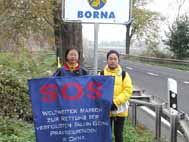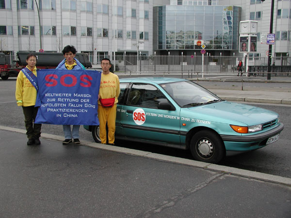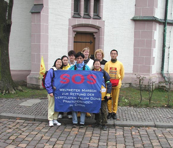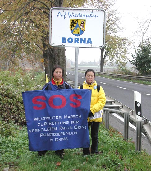 经过很长一段时间的准备,我们终于于11月7日从柏林出发了。9点钟,我们三位步行者与我们小组的协调人相会在中国大使馆对面的大桥上,一同发正念。在同警察联系好以后,我们迈开了步伐(我们发现向警察局通知我们的步行活动非常好,一来可以借此机会向他们讲真相,二来还得到不少他们有利的建议和帮助。)我们穿过了亚历山大广场以及柏林最有名的unter den Linden大街和波茨坦广场,走上了国家公路。天稍微下着一点小雨,但我们的步子迈得很坚定。我们一直念着师父的的口诀。近8小时后我们到达了第一站:波茨坦城。一天下来,双脚很沉。在波茨坦城绕了好几圈,我们也未能找到可以留宿的地方。就这样,三人挤在小小的车中过了一宿。
