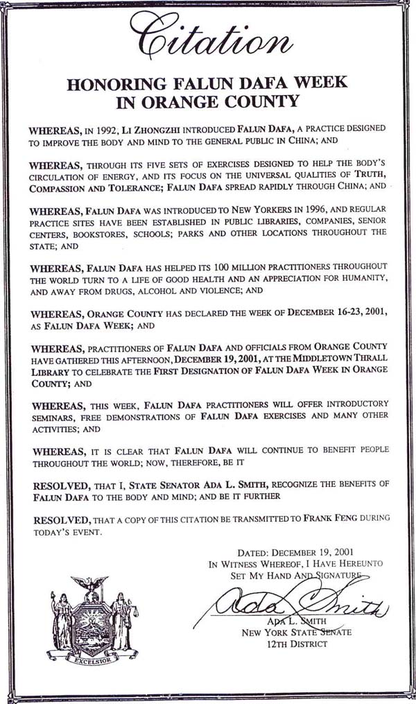 为此,我,爱德.史密斯,州参议员,表彰法轮大法在改善身体和精神方面的作用;同时还决定将本嘉奖令在今天的活动中转交给弗朗克.冯。