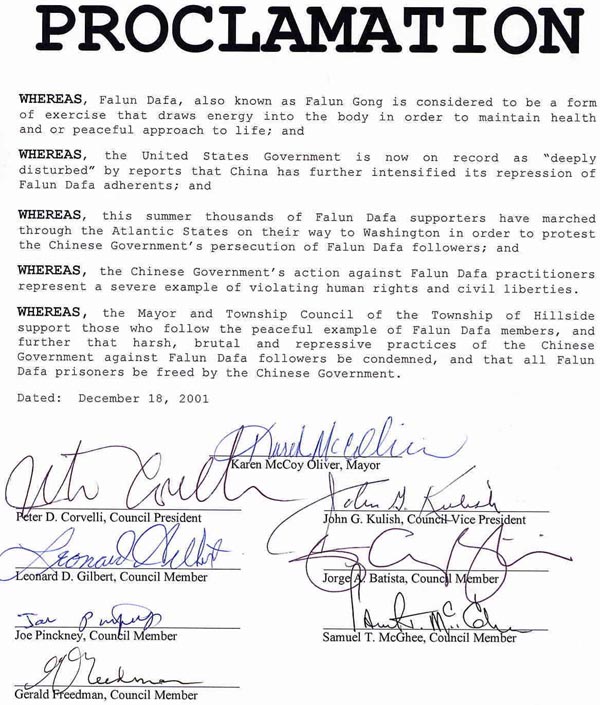 为此,希尔赛德市(Township of Hillside)市长和市议会决定:全力支持那些以平和的法轮大法学员为榜样的人们,谴责中国(江泽民)政府对法轮功学员的残酷迫害和镇压,呼吁释放所有被关押的法轮大法学员。 日期:2001年12月11日