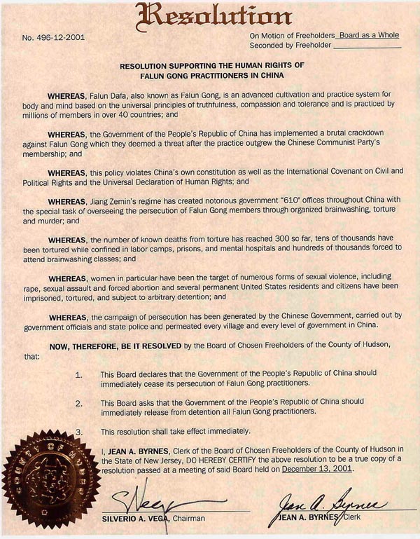 鉴于,这场由中国政府发动,政府官员和警察执行的迫害运动渗透到每一个村庄及每一级政府。为此,哈德逊县(County of Hudson)县议会决定: