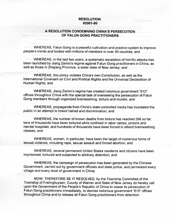 因此,现在,新泽西州沃伦郡弗雷灵惠森镇委员会特此通过决议,呼吁中华人民共和国政府立即停止迫害法轮功学员,撤消全国各地的臭名昭著的“610”办公室,立即释放所有被关押的法轮功学员;