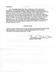 决议进一步决定,此决议经过确证的副本将分别呈送尊敬的美国总统乔治.布什、国务卿考林.鲍威尔、美国参议员约翰.考辛(John Corzine)、美国参议员罗伯特.托里赛利(Robert G. Torricelli)、美国众议员拉什.霍尔特(Rush Holt)、新泽西州代理州长唐纳德.迪弗兰西斯科(Donald DiFrancesco)、中华人民共和国驻美大使杨洁篪、中国驻纽约总领事张宏喜、中国河北省石家庄市市长、江苏省南通市市长和苏州市市长。