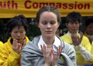莉莲.斯太芙(Lilian Staf),25岁,一位居住在英国伦敦的瑞典法轮功学员,2001年12月21日星期五在香港和其他修炼者一起打坐。在该精神团体的西方学员因举行了一次法轮功请愿而被中国当局驱逐出境后,其中五位学员星期五在香港举行了抗议,他们说,他们遭到大陆警察的殴打并且身上留有瘀伤。