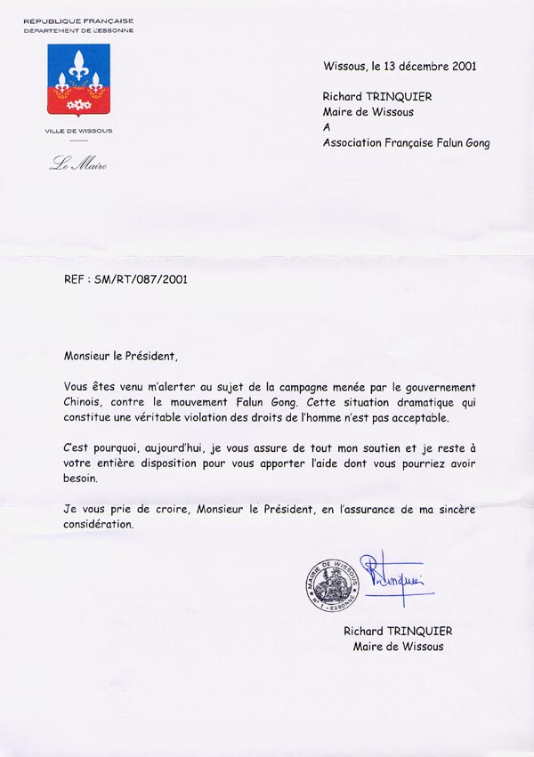 理查·檀吉尔(Richard TRINQUIER)埃松省(Essonne)威苏市(Wissous)市长致法国法轮功协会主席