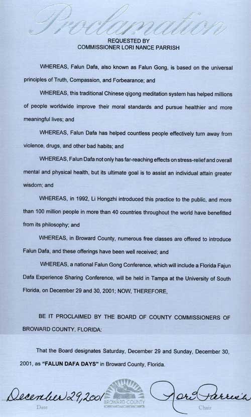 【明慧网2001年12月27日】佛罗里达州包和县议会宣布2001年12月29-30日为该县“法轮大法日”。