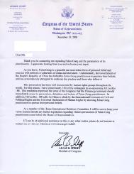 这类迫害已经被全世界范围内的人权组织作了详尽的记录。正因为如此,我与100多位其他同事一起共同签名支持了众议院188号决议。这个决议表达了国会要求中国立即停止迫害、拘押和酷刑折磨法轮功学员。另外,188号决议还呼吁中国遵守《国际民事及政治权利公约》和《国际人权宣言》,允许法轮功学员追求个人的信仰。