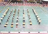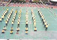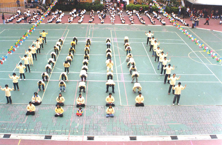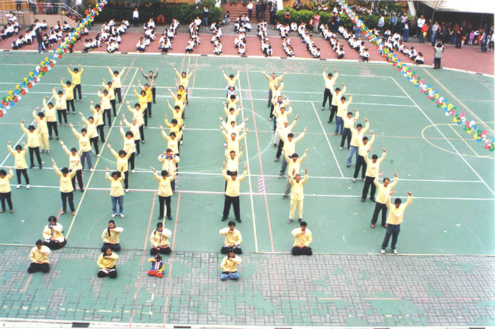 十二月八日表演时约六十个学员,录音带是一、三、四套各炼一遍,我们表演队伍是正方形,最前面2排表演神通加持法,队伍的两侧表演法轮桩法,事先有发小纸条说明什时候变掌或换抱轮姿势,中间跟着音乐带表演一、三、四套功法,表演时我拿着简介到典礼台上发给来宾,发完后我也去跟着表演第二套功法,表演结束时校长颁发感谢状,在普度济世的音乐中退场。