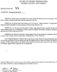 为此,摩利丝县县议会决定:本政府机构全力支持那些以平和的法轮功学员为榜样的人们,谴责中国(江泽民)政府对法轮功学员的残酷迫害和镇压。