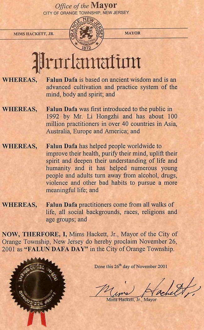 【明慧网2001年12月3日】2001年11月26日,新泽西州当选众议员,桔市市长海克特(Hackett)先生为表彰法轮大法及其创始人李洪志大师对桔市的贡献,宣布2001年11月26日为桔市“法轮大法日”。在褒奖状中,海克特市长称赞法轮大法帮助世界上40多个国家的人民改善了身体健康,净化了思想,提升了精神境界,加深了对生活与人生的理解,同时还帮助了众多的年青人和成年人戒除了酒精、毒品、暴力以及其它不良习惯,转而追求更有意义的生活。