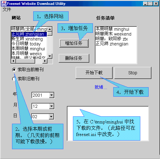 【明慧网2001年12月4日】11月19日的自由网中文版包括下载网站的Windows界面(GUI),下载网站大为简化,在安全性和速度方面有很大改进,推荐使用新版。我们在原中文版的基础上增加了下载明慧的Windows界面(GUI),安装办法是:先安装11月19日的自由网版本,然后从这里下载自由网下载软件包,解压后用Getmh.bat和freesites.txt代替原带的对应文件。运行Getmh.bat即进入下载GUI。