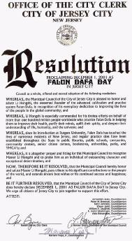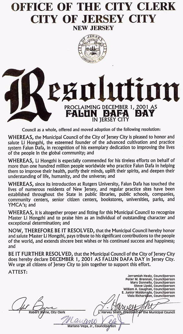 为此,泽西市市议会决定:宣布2001年12月1日为泽西市“法轮大法日”。我们号召泽西市全体市民共同支持这一决议。